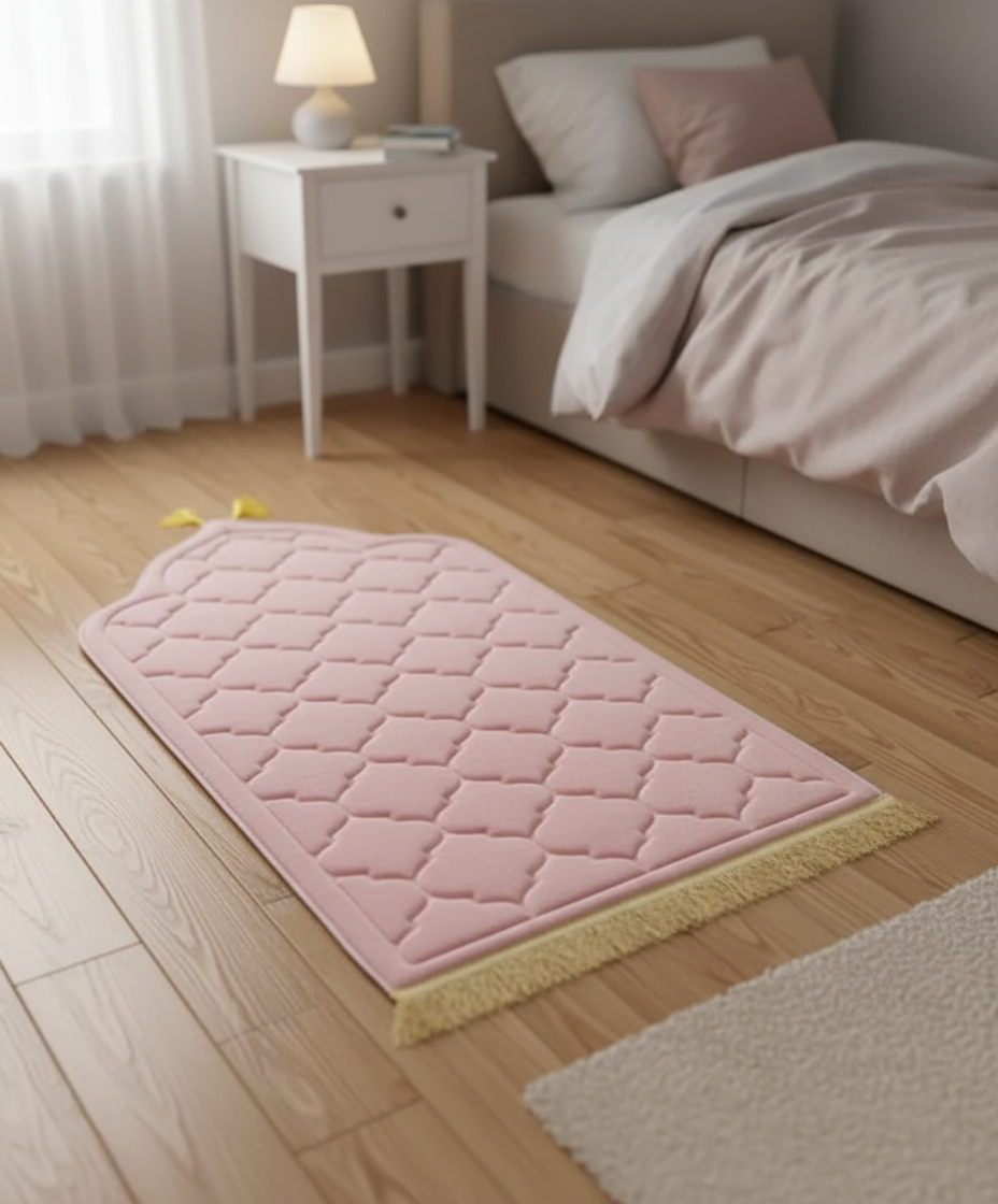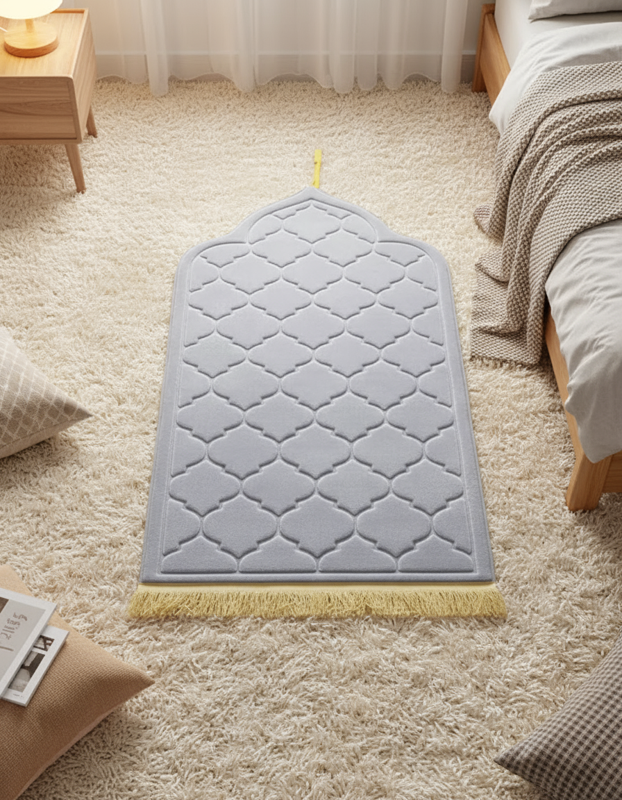 Tapis de prière en flanelle douce au design élégant et raffiné. Conçu en fibres de polyester de haute qualité, il est à la fois agréable au toucher, durable et facile à entretenir.